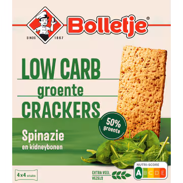 Bolletje Low Carb Groente Crackers bieden een smakelijke en verantwoorde keuze voor tussendoor, ontbijt of lunch. Met een unieke samenstelling die 50% groenten bevat, waaronder rode kidneybonen en spinaziepuree, combineert dit product smaak met voedingselementen die passen bij een bewuste levensstijl. De crackers zijn speciaal ontwikkeld om een lager koolhydraatgehalte te bieden, wat ze geschikt maakt voor mensen die hun koolhydraatinname willen beperken zonder in te leveren op smaak.