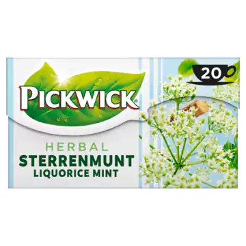 Pickwick Sterrenmunt offers a distinctive herbal tea blend that brings together the refreshing flavors of licorice, aniseed, fennel, and peppermint. This carefully crafted spice combination creates a star mint flavor, ideal for those who appreciate a mild yet flavorful tea without caffeine.