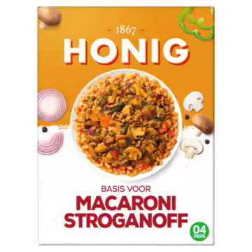 Honig Mix voor Macaroni Stroganoff is een handige maaltijdmix die je binnen 20 minuten een heerlijke pasta oplevert, geschikt voor 3 tot 4 personen. Met deze mix voeg je eenvoudig rijke smaken toe aan je gerecht, waardoor je snel een complete maaltijd op tafel zet, zelfs op drukke dagen of als je weinig tijd hebt.