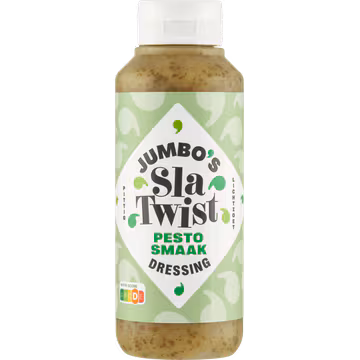 Jumbo’s Sla Twist Pesto Smaak Dressing geeft je gerechten een smaakvolle Italiaanse twist met de frisse smaak van basilicum en een romige toets van smeltkaaspoeder. Deze dressing is perfect om salades, broodjes of pastagerechten extra smaak te geven.