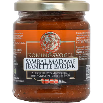 Of je nu zelf een rijsttafel bereidt of een eenvoudige maaltijd een extra dimensie wilt geven, Koningsvogel Sambal Madame Jeanette is een betrouwbare smaakmaker die elke keuken opfleurt met zijn karakteristieke hitte en aroma. Bestel eenvoudig en snel bij Real Dutch Food, de specialist in Nederlandse producten wereldwijd.