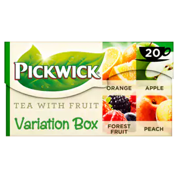 Pickwick Fruit Variatie Groen Vruchtenthee biedt een assortiment van vier verschillende gearomatiseerde zwarte theesmaken met fruit. De verpakking bevat 20 zakjes, elk geschikt voor een verse kop thee met een fruitige twist.