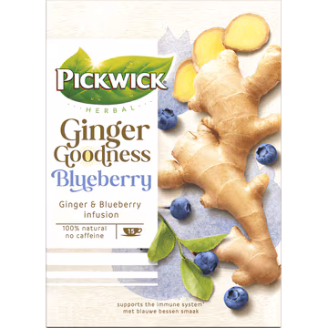 Ontdek de verkwikkende smaak van Pickwick Ginger Goodness Blueberry kruidenthee met 15 handige zakjes. Geniet van een stimulerende mix van gember en blauwe bes, perfect voor een moment van ontspanning zonder cafeïne.