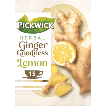 Ontdek de verkwikkende smaak van Pickwick Ginger Goodness Lemon met 15 handige zakjes voor heerlijke gemberthee met citroen. Geniet van een cafeïnevrije kruidenthee die je op elk moment van de dag ontspanning en warmte biedt.