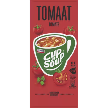 Unox Cup a Soup Tomaat biedt een snelle en smaakvolle oplossing voor een warme maaltijd of tussendoortje. Dankzij de handige cups van 12 gram per stuk, in een verpakking van 21 stuks, heb je altijd een portie tomatensoep bij de hand die eenvoudig te bereiden is.